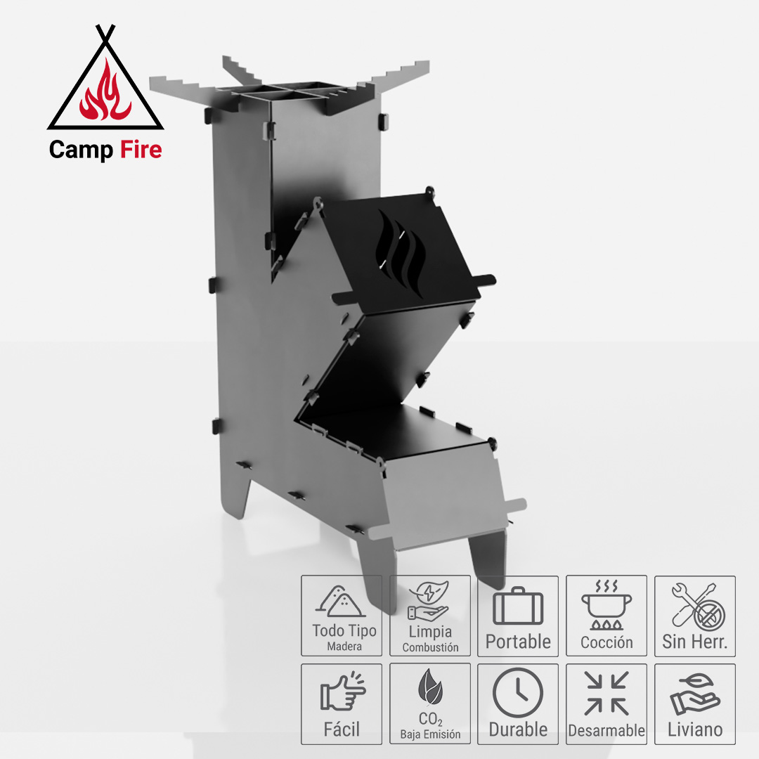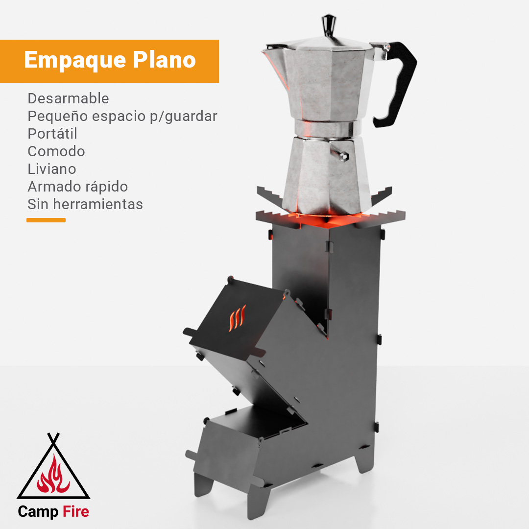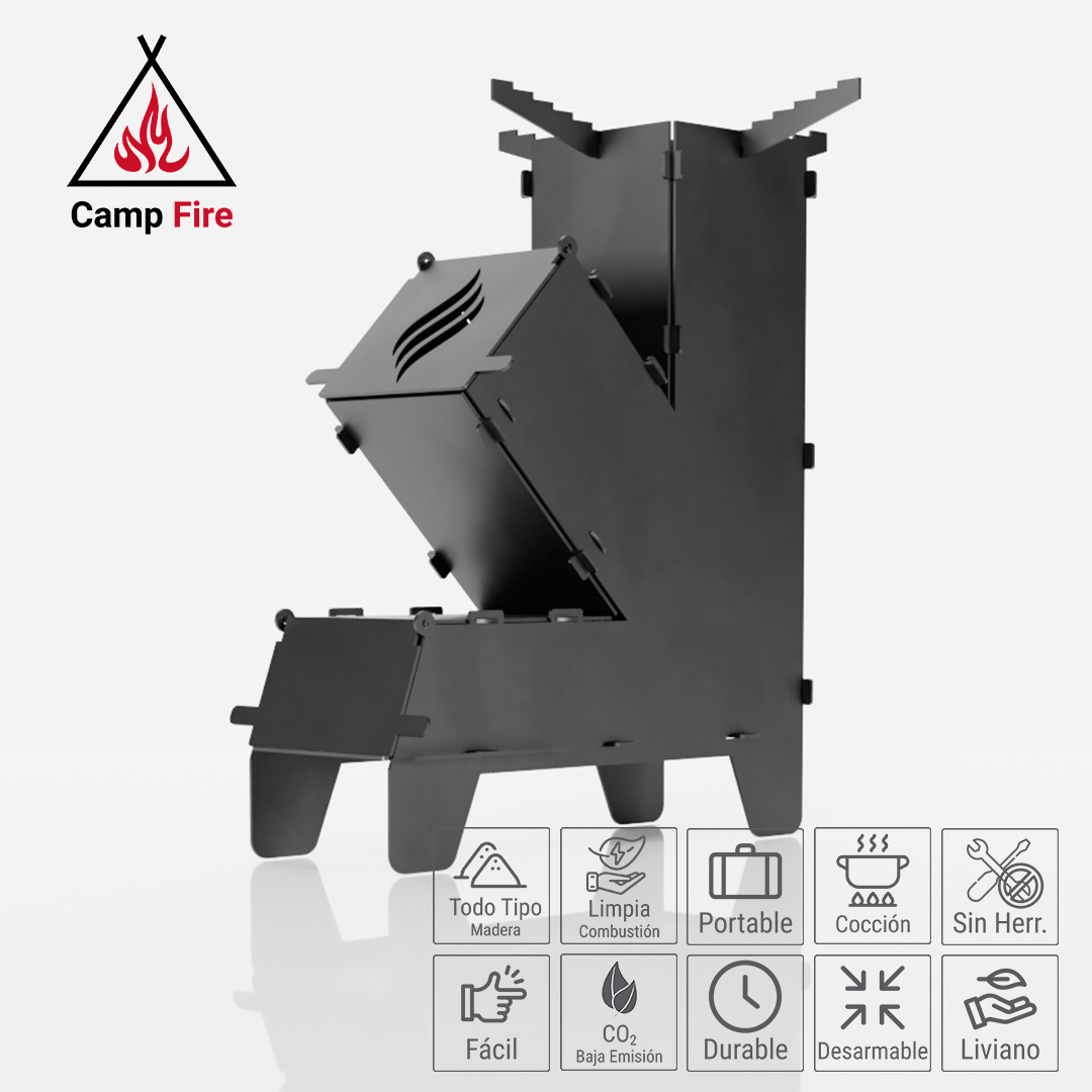 Durable y de bajo consumo. Utiliza biomasa sólida y seca como ramitas, piñas, hierba seca, ramas, corteza de árbol, carbón vegetal, pellets. Pesa 7 kg y es portátil, lo cual es una excelente solución para cocinar al aire libre.